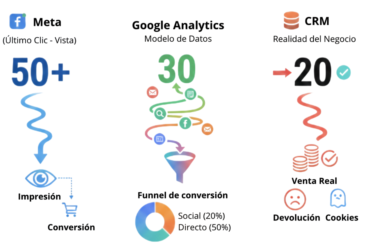 Si trabajas en marketing digital, seguramente has vivido este momento: abres el Business Manager de Meta y ves 50 conversiones. Abres Google Analytics y solo ves 30. Luego, vas a tu CRM y solo aparecen 20 conversiones reales.
